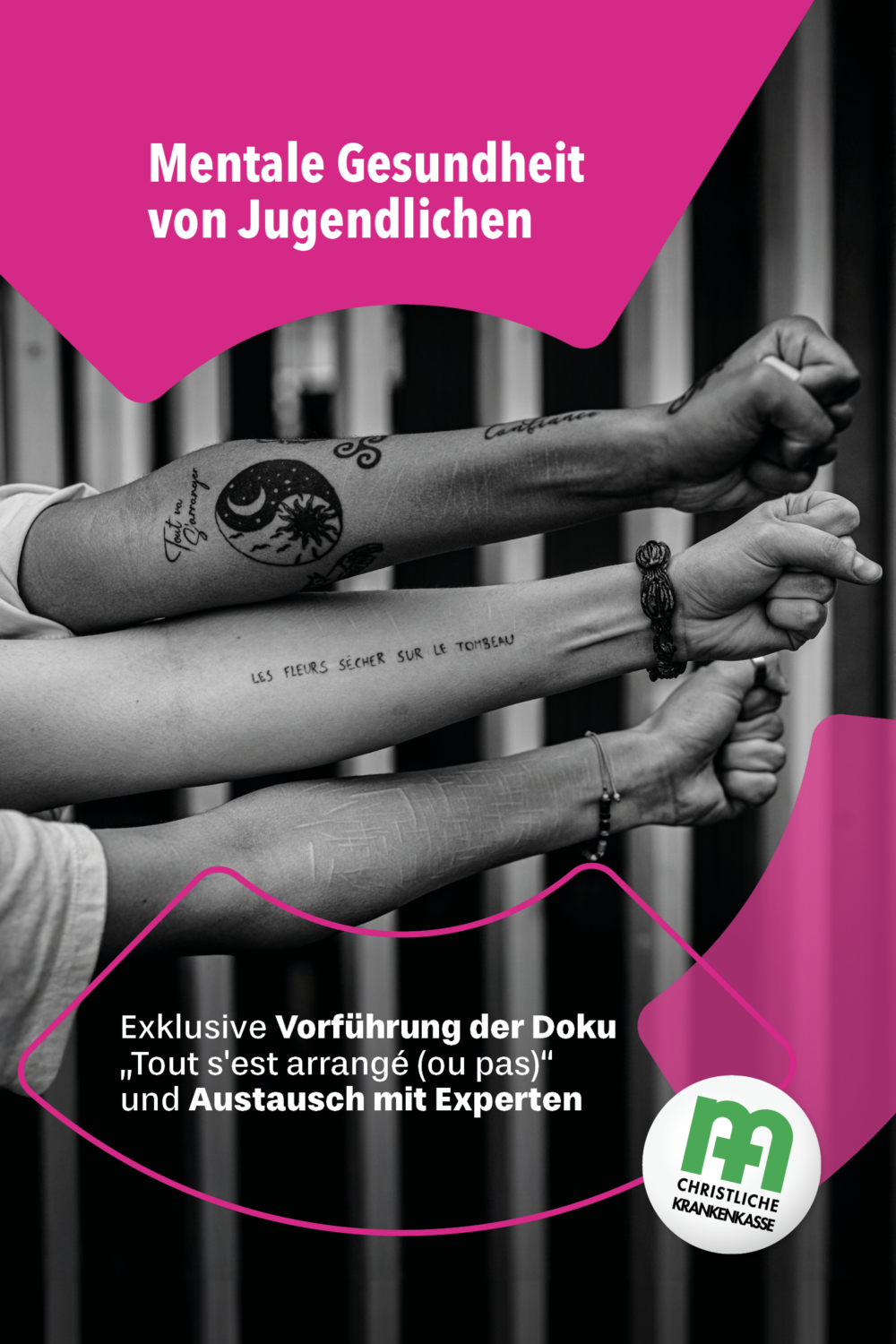 Mentale Gesundheit junger MenschenTout s’est arrangé (ou pas)Do 16.10. 19:00 UhrCKKFreier Eintritt. Infos und Anmeldung auf ckk-mc.be/dokuDokumentationDie CKK lädt zu einer exklusiven Vorführung des Dokumentarfilms „Tout s'est arrangé (ou pas)“ des Journalisten und Regisseurs Pierre Schonbrodt ein. Der Film widmet sich der mentalen Gesundheit junger Menschen und begleitet eine leidende Jugend. Im Anschluss an die Filmvorführung findet eine Podiumsdiskussion mit Experten aus verschiedenen Bereichen statt. In französischer Sprache mit deutschen Untertiteln.