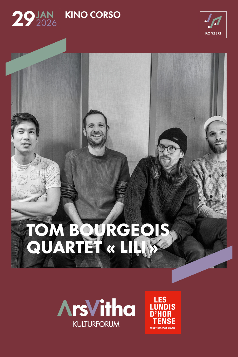 KonzertTom Bourgeois Quartet «Lili »Do 29.01. 20:00 UhrTarife (VVK): 6/12€JazzTickets: [email protected]Mit „Lili“ widmet der französisch-belgische Saxophonist und Komponist Tom Bourgeois sein neues Quartettprojekt der außergewöhnlichen Komponistin Lili Boulanger (1893–1918). Gemeinsam mit seinem Quartett erschafft Bourgeois eine Klangwelt, in der Jazz, impressionistische Einflüsse und zeitgenössische Musik mühelos ineinandergreifen. -
