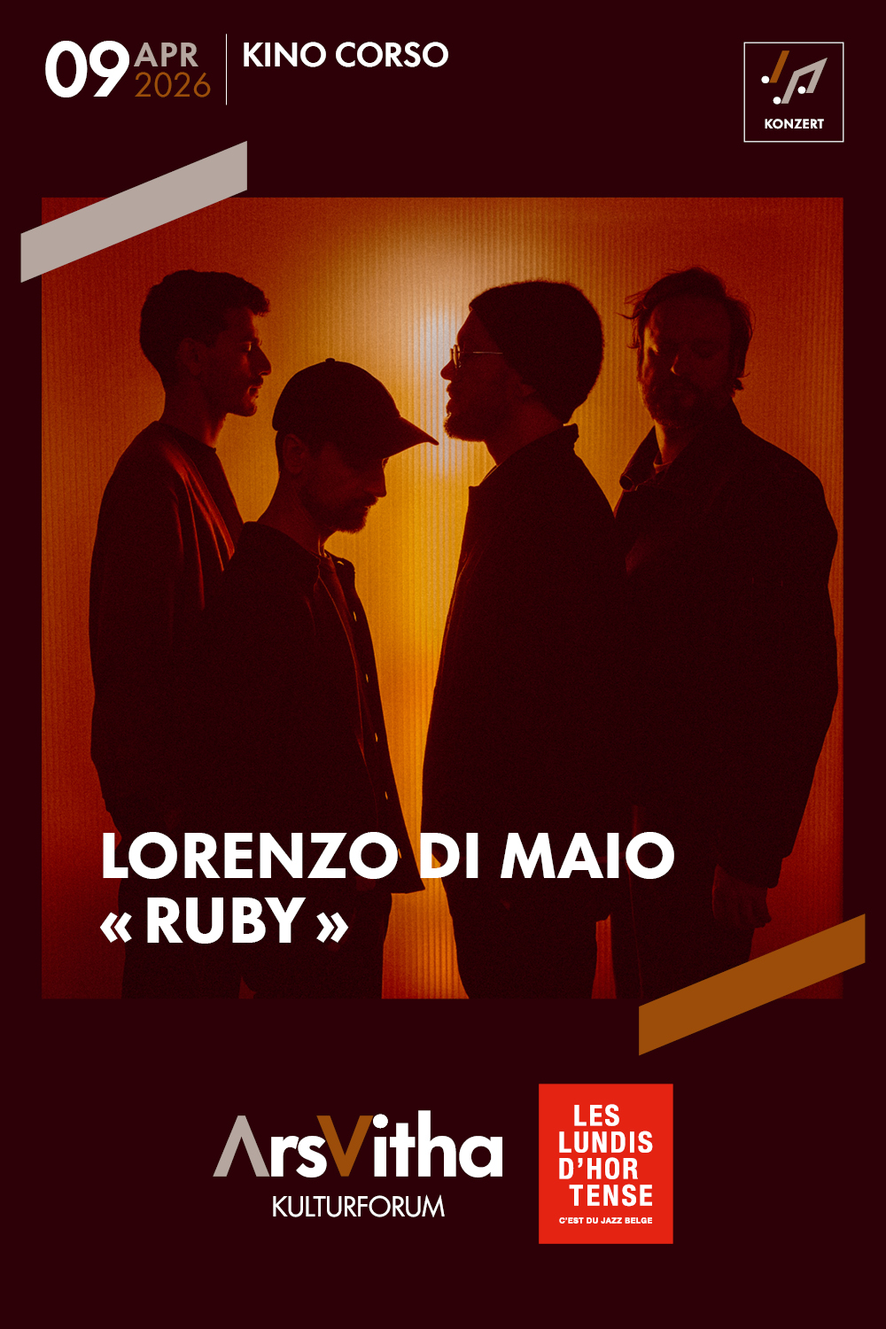 KonzertLorenzo Di Maio "Ruby"Do 09.04. 20:00 UhrJazzMit “Ruby” präsentiert der belgische Gitarrist Lorenzo Di Maio sein bislang persönlichstes Projekt: ein kraftvolles, zugleich lyrisches Quartett an der Schnittstelle von Jazz und Rock. In diesem Quartett ohne Bassisten steht der Synthesizer im Vordergrund und übernimmt die Basslinie und eröffnet ein breites elektrisierendes Klangspektrum. -