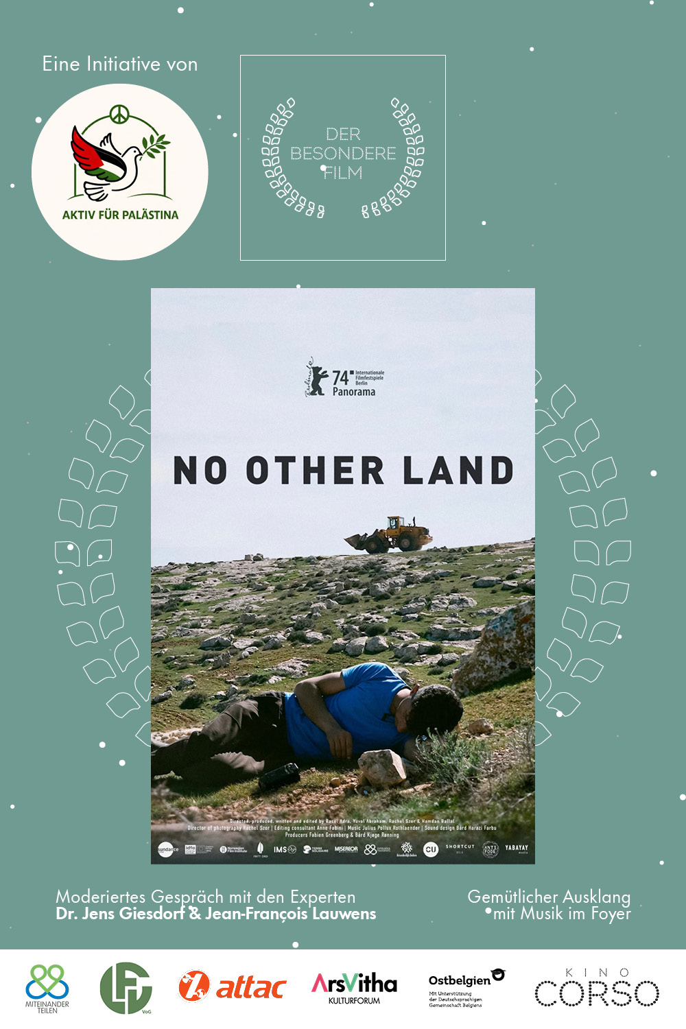 "Aktiv für Palästina" präsentiertNo Other LandDo. 07.05. 20:00 UhrFilm mit Gesprächsrundeab 0'mit Pause2018DokumentationDie Initiative „Aktiv für Palästina“ sowie ArsVitha, Miteinander Teilen, der Landfrauenverband und Attac DG laden zu einem besonderen Kinoabend ins Kino Corso ein. Gezeigt wird der preisgekrönte Dokumentarfilm „No Other Land“, gefolgt von einem Austausch mit ExpertInnen. Die Veranstaltung markiert eines der ersten Projekte der neu gegründeten Bürgergruppe -